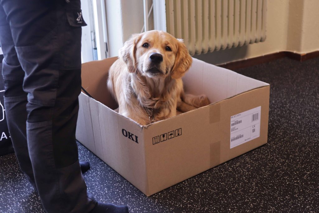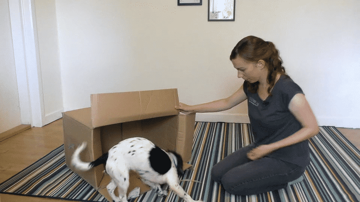 Den här övningen är en optimismlek där vi vill se att hunden vågar gå i med hela kroppen och utforska i lådan. För att komma igång ställer du ner kartongen på golvet och slänger i lite godis i botten. Har du en djup kartong, lägg den på sidan om din hund inte känner sig bekväm med att kliva i. Låt hunden sträcka sig in eller gå in med tassarna och leta upp godbitarna i sin egen takt. Målet är att hunden går in med alla fyra tassarna, då vet vi att den känner sig självsäker. När hunden är bekväm kan du göra det svårare genom att slänga burkar och flaskor i botten eller byta till en annan låda. Tänk på att du kan behöva hålla i lådan i början, eftersom osäkra hundar brukar backa ur snabbt, vilket kan få lådan att välta.